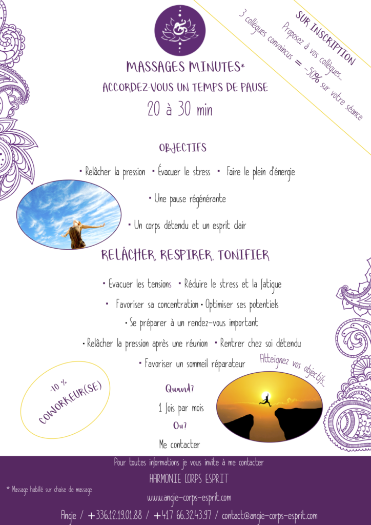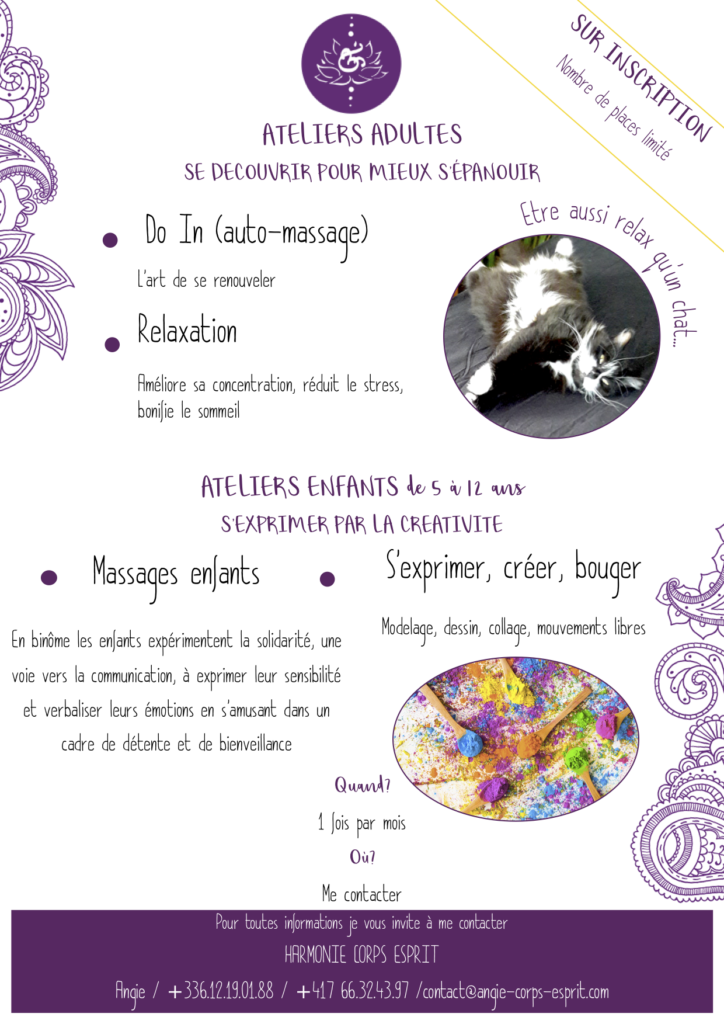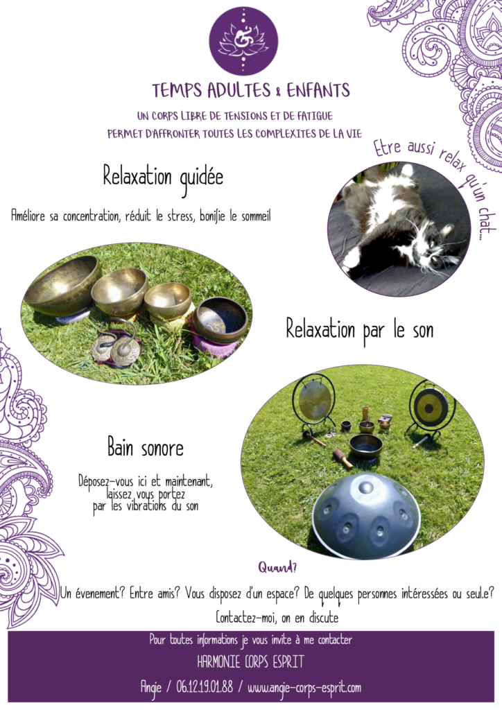Quoi d’autres ? Relaxations, bain sonore individuelle ou en groupe Des ateliers… Massages minutes en espace de co-working et ailleurs…